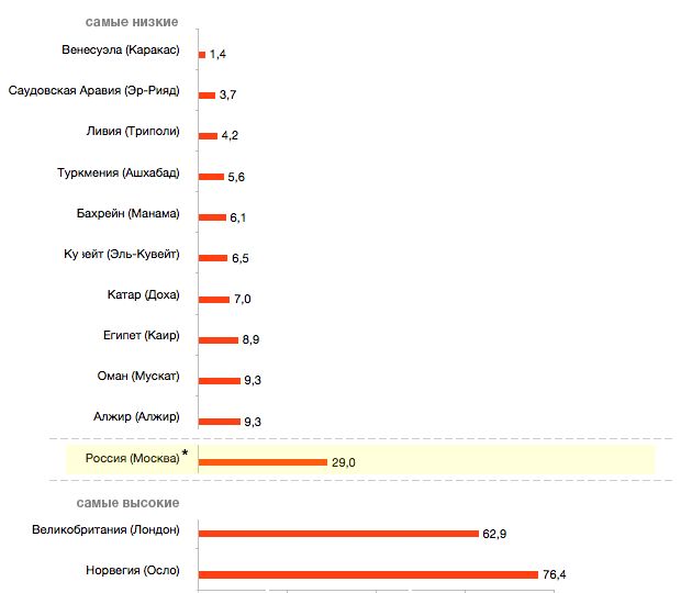 | ой какой бред, че у вас в головах то? цены выросли... угу во всем мире дешевеют а у нас выросли, Путин ночами бегает нолики на ценниках пририсовывает... угу мне лично заплатили, канеш, лучший способ спора, убедить что оппонент лично заинтересован =) в каких странах ниже то? в сауди арабии? катаре? сравни население и потребление нефти на душу...